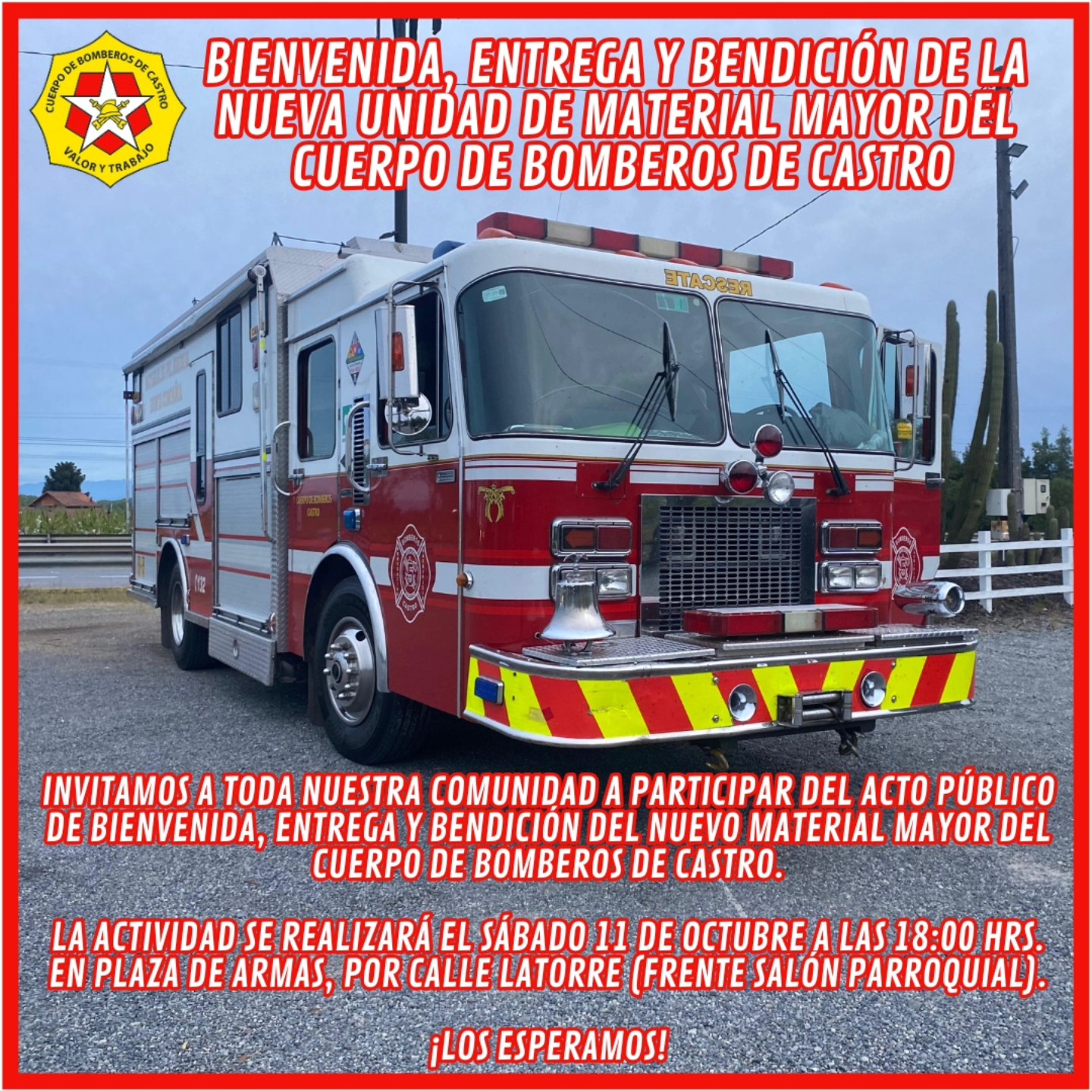 Invitamos a toda nuestra Comunidad a participar del Acto Público de Bienvenida, entrega y bendición del nuevo Material Mayor que vendrá a complementar nuestras filas y a optimizar el servicio a nuestra Comunidad. El Acto se llevará a cabo el DÍA SÁBADO 11 DE OCTUBRE A LAS 18:00 HRS. en Plaza de Armas, por Calle Leer más